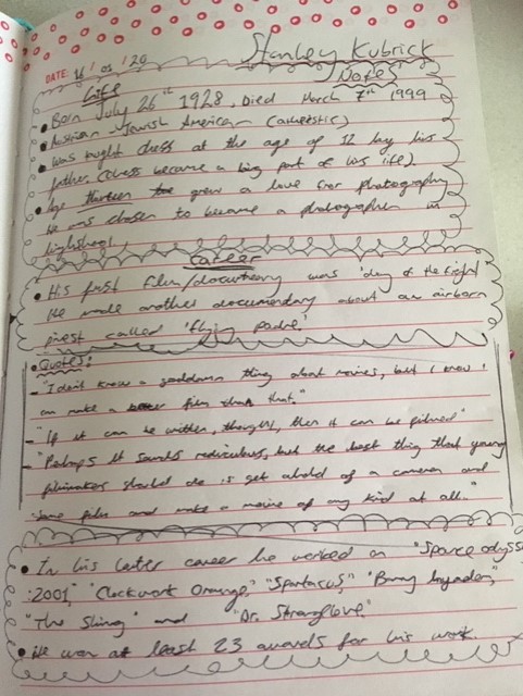 For my research essay I will write about the famed director Stanley Kubrick, for the past week I have been reading about him, gathering information and putting that all in my notes (below).
